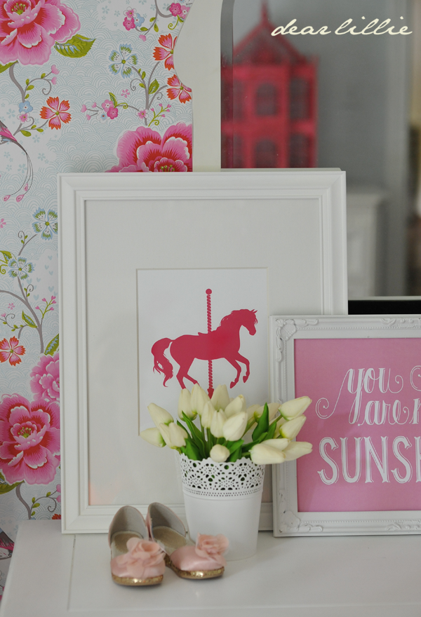 The girls really wanted a bright pink room. I didn't really want to paint the walls bright pink so I thought doing a wallpaper with bright pink flowers and lots of bright pink accents throughout the room would still make the room feel very bright and very pink but still be something that I would like too. I have to say I love it now as much as they do!